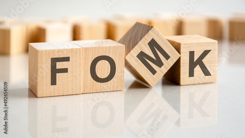 four wooden blocks with the letters FOMK on the bright surface of a gray table, business conceptual word collected of of wooden elements with the letters