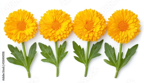 Four Yellow Flowers with Green Leaves on White Background