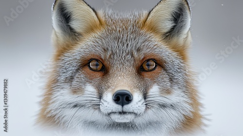 Fox portrait, face forward in snow. Intense animal gaze, winter backdrop, blurry