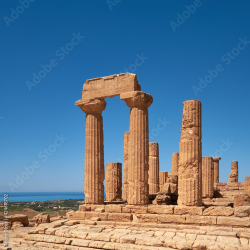 sicilia, temple, agrigento, juno, day, blue skies, summer, sunny, italian, greek, ancient, architecture, stone, column, site, landmark, europa, travel, history, old, archaeologic, view, ancient civilization, historic, historical building, no people, nobody, column, vale, ruin, ruined, pillar, outdoors, sicilian, mediterranean, archaeology, valley of the temples, closeup, element, fragment