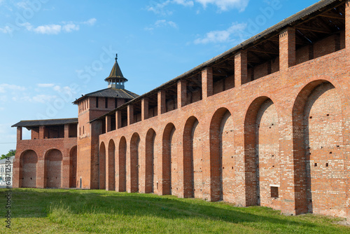 Fragment of the ancient wall of the Kolomna Kremlin on a sunny June day. Kolomna. Moscow region, Russia