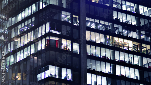 Fragment of the glass facade of a modern corporate building at night. Modern glass office in city. Big glowing windows in modern office buildings at night, in rows of windows light shines.