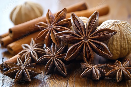 Fragrant Spices Arrangement: Close-up Still Life of Star Anise, Cinnamon Sticks and Nutmeg on Wooden Background, Evoking Warmth and Culinary Traditions.