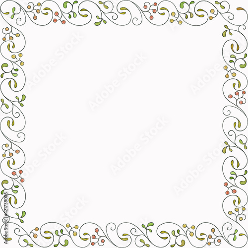 Frame from floral ornaments in yellow, green, red colors, painted with watercolors: leaves, berries, stems, isolated on a white background