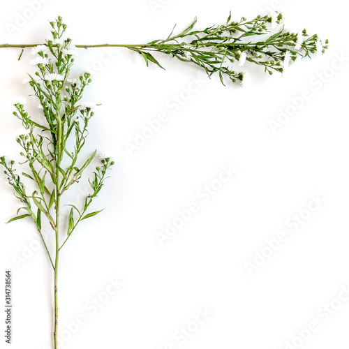 Frame from white flowers on a white background with space for text. Bouquet of wild flowers. Green floral background. Top view. Copy space. Mock-up