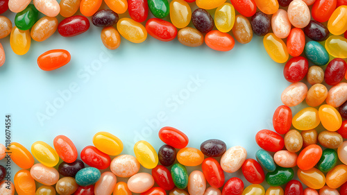 jelly, bean, candy, background, frame, food, children, table, space, blue, colours, rainbow, flat, colourful, dessert, sugar, snack, wooden, text, favor, confectionery, bean, sweet, product, confection, gelatin, glucose, variety, dragee, copy, assorted, bright, chewy, delicious, different, eat, fruity, group, gummy, jelly bean, lay, made, many, many-coloured, object, tasty, top, treat, view