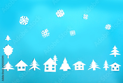 Frame made of white paper figures - houses, Christmas trees, snowflakes on a blue background