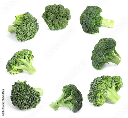 Frame of fresh green broccoli on white background