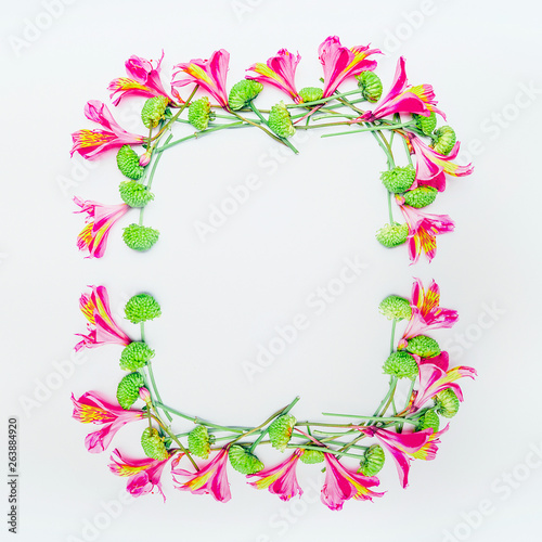 Frame of pink and green exotic flowers on white background, top view. Copy space. Floral frame. Flat lay