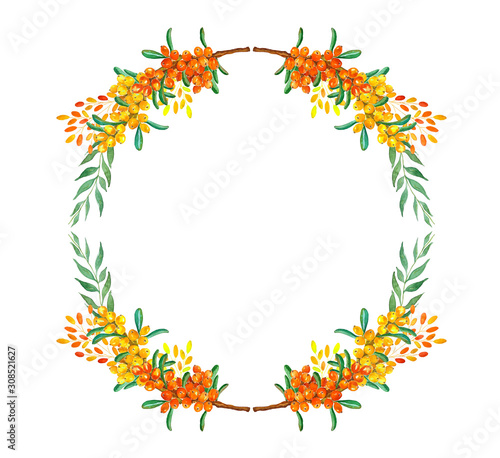 Frame with branches and buckthorn berries, watercolor illustration for wedding invitation or greeting card