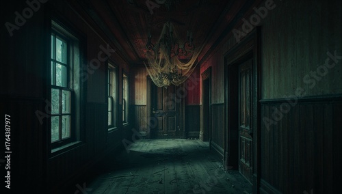 corridor, wooden, luxury home, chandelier, abandoned, vintage, dilapidated, interior, gothic, neglected, decay, narrow, tattered, hanging, fabric, closed door, floorboard, dusty, worn, debris, shadow, daylight, light fixture, dark, passage, hallway, empty, decorative, clothes, structure, natural light, central, wood