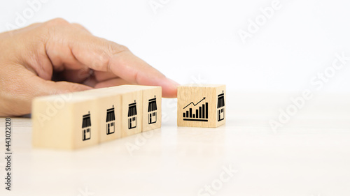 Franchise, Close-up hand choose cube wooden toy block stack with graph icon for best quality franchises business growth and branch expansion marketing planning and bank loan.