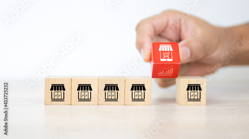 Franchise, Hand choosing cube wooden blocks stack with franchise business store E-commerce smartphone with graph icon for business growth and change to online financial marketing concepts.
