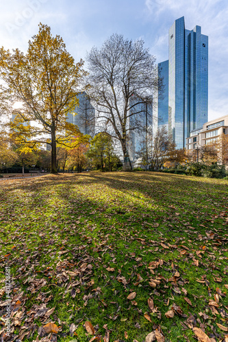 Frankfurt, Germany, November 2020: Beautiful facades of the Deutsche Bank towers in Frankfurt am Main