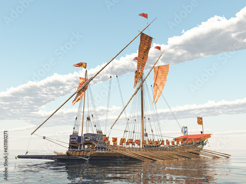 galley, warship, rowing, oarsman, flagship, ship, shipping, voyage, transport, adventure, nostalgia, sea, ocean, illustration, three-dimensional, blue, heaven, daytime, outside, sunny, nobody