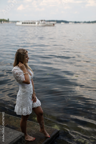 woman, beach, sea, water, summer, pretty, young, dress, beauty, ocean, white, blue, heaven, person, nature, vacation, hair, sand, see, outdoors, happy, model, fashion, children, back