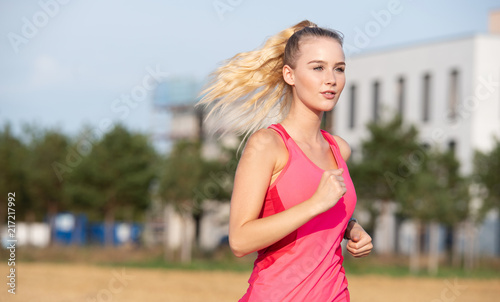 jog, sport, woman, young, athletic, shape, persistence, happy, training, fitness, sympathetic, laugh, smile, objective, body, take off, active, move, blond, attractive, slim, pretty, pink, pink, motivation, outside, nature, alone, person, fit, health, healthy, vitality, well-being, leg, upper body, braid, face, runner, run, summer, sun, park