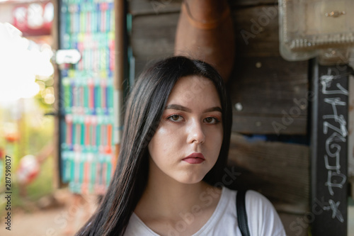 woman, portrait, young, pretty, people, smiling, happy, smile, beauty, face, fashion, brunette, hair, person, business, pretty, shop, city, casual, white, model, student, wall, market