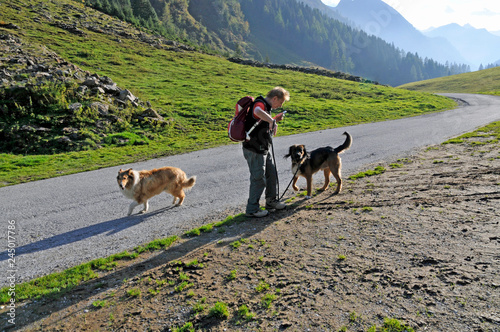street, dog, woman, countryside, mount, mountain, roadside, alpen, meadow, forest, nature, hike