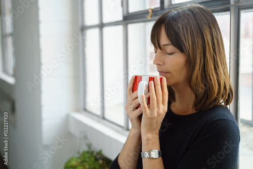 frau steht am fenster und hält eine rote tasse in der hand
