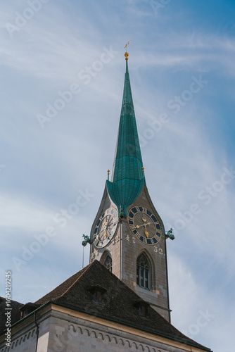 Fraumunster church tower reaching for the sky in zurich, switzerland