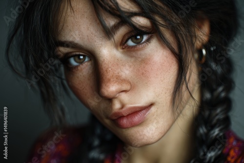 woman, freckle, braid, intense, lighting, dramatic, face, expression, shadow, contrast, young, serious, portrait, closeup, dark, indoor, bold, coiffure, natural, mood, raw, style, mysterious, candid, styled, feminine, atmospheric, sharp, moody, confidence, feature, presence, striking, emotional, isolated, visual, light, authenticity, deep, skin
