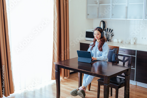 freelancer, woman, working, home, tablet, computer, earphones, sitting, kitchen, asian, table, wooden, laptop, female, job, occupation, lifestyle, online, technology, communication, office, work, business