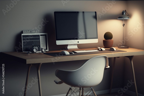 creativity, desk, desktop, display, keyboard, loft, monitor, room, screen, workplace, workspace, device, interior, computer, home, technology, white, equipment, workstation, chair, comfortable, cool, designer, furniture, freelance, gaming, hardware, home office, indoor, online, player, station, streamer, stylish, work, illustration, ai, artificial intelligence, artwork, style, clean, professional, frame, copy space, warm