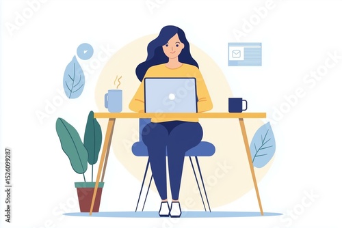 Freelancer, business woman working at laptop with coffee mug. Female character, freelance worker sitting at table with computer, browsing online. Flat vector illustration isolated on white background
