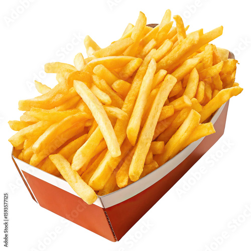 French fries served in classic red white striped box concept. Delicious golden French fries piled high in a classic box.