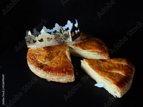 French puff pastry and almond cream Kings Cake, or Galette des Rois, crown on top, a slice cut showing the charm inside, on black background