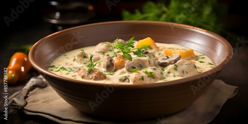 French veal stew with creamy sauce and vegetables Blanquette de Veau. Concept French cuisine, Veal stew, Creamy sauce, Blanquette de Veau, Vegetables