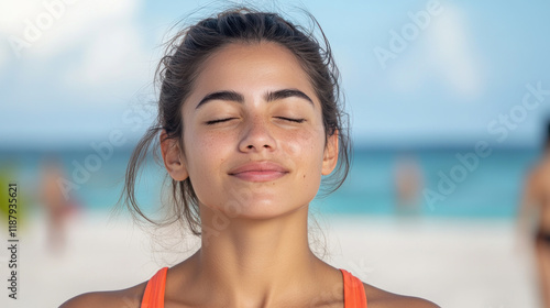 French woman breathing and relax on Idyllic beach at Playa del Carmen