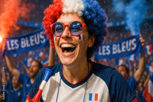 france, fan, woman, white, skin, curly, wig, red, blue, foulard, text, sunglasses, smiling, cheering, horn, jersey, stadium, celebration, national, pride, female, joy, support, sport, passion, crowd