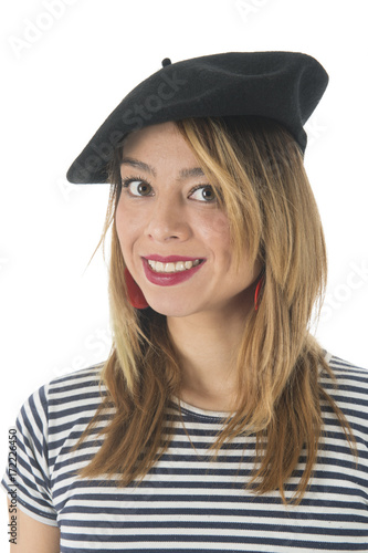 french, typical, young, woman, girl, barret, striped, shirt, black, white, portrait, european, studio, isolated, background, cap