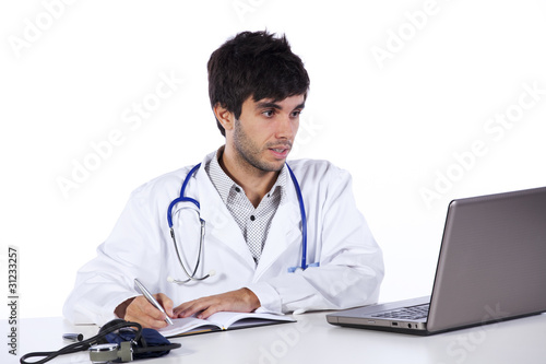 frendly young doctor working with his laptop