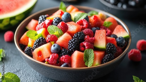 Fresh and colorful fruit salad with watermelon and berries.