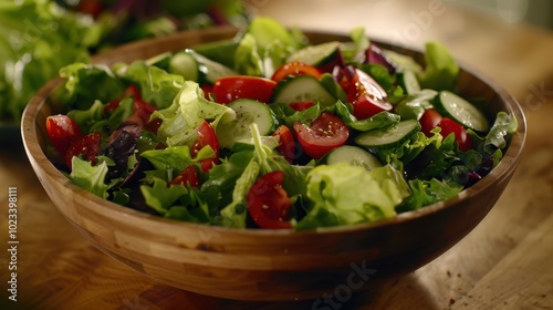 Fresh and Colorful Garden Salad in Wooden Bowl