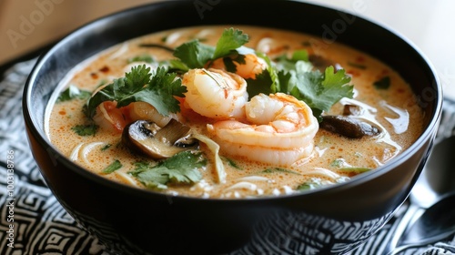 shrimp, soup, bowl, ingredient, noodle, herb, cookery, food, meal, dinner, cooking, epicure, spice, broth, nourishment, culinary, garnish, seafood, asian, fresh, tasty, hot, liquid, warmth, comfort, delicious, plate, design, culture, wooden, eatery, serve, spice, organic, closeup, traditional, kitchen, healthy, portion, creamy, texture, aroma, soy sauce, preparation, chopstick