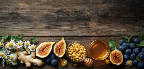 Fresh and dried figs, honey, blueberries, and flowers are beautifully arranged on a wooden table