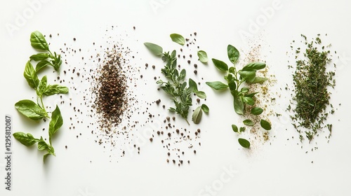 herb, basil, oregano, thyme, parsley, rosemary, cooking, kitchen, food, ingredient, spice, natural, aromatic, fresh, dry, arrangement, botanical, green, seasoning, favor, health, cookery, organic, culinary, garnish, food preparation, nourishment, freshness, vegetarian, receipe, nature, herbal, garden, culinary arts, texture, wellness, diet, fresh produce, vibrant, colours, aesthetic, white background