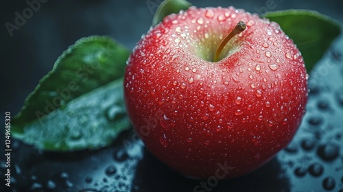 apple, red, water droplets, fresh, juicy, fruit, leaf, green, wet, closeup, healthy, nature, food, crisp, delicious, vibrant, still life, freshness, ripe, stem, surface, detail, macro, dew, background, produce, nourishment, natural, sweet, garden, organic, refreshment, raw, texture, isolated, glossy