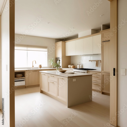 fresh, neutral, kitchen, minimalist, scandinavian, japanese, zen, clean, bright, airy, serene, contemporary, light, fusion, functional, modern, stylish, space, layout, appliance, cabinetry, photo, interior, lighting, composition, detail, accessory