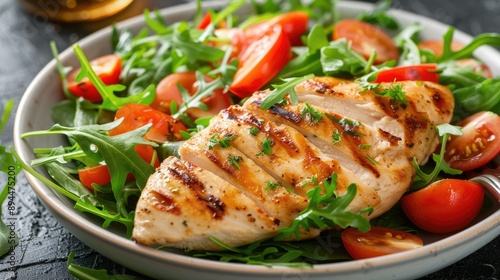 Fresh and nutritious dish featuring grilled chicken breast fillet and a colorful green salad with arugula