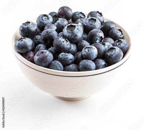 Fresh and raw blueberries with drops of water. In white bowl and ready to eat. Isolated with copy space.