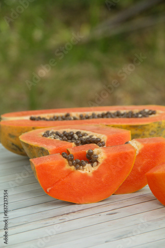 Fresh and ripe sliced papaya or Carica papaya L, fresh papaya pieces neatly arranged on an outdoor table