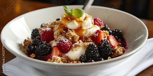 Fresh and vibrant breakfast bowl filled with berries, granola, yogurt, and a drizzle of honey to start your day right.