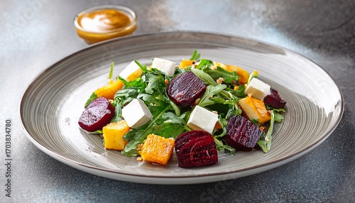 Fresh Arugula Salad With Roasted Red And Yellow Beets White Cheese Chunks Herbs And Dressing On Transparent Background