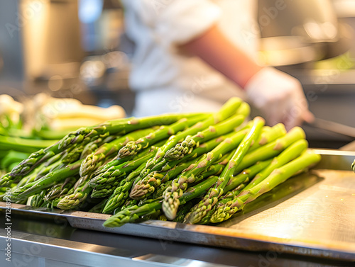 Fresh asparagus on a metal tray in a professional kitchen, with a chef working in the background