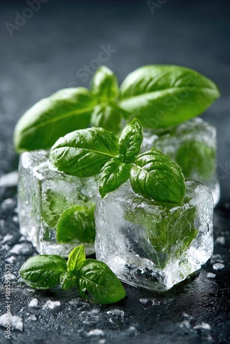 basil, ice, cube, leaf, fresh, green, food, culinary, aromatic, flavorful, cooling, refrigerated, healthy, natural, vegetarian, cooking, garnish, ingredient, receipe, kitchen, closeup, detail, texture, water, drop, dark, background, wet, crisp, cool, refreshing, organic, soothing, bright, vibrant, nature, image, food photography, closeup
